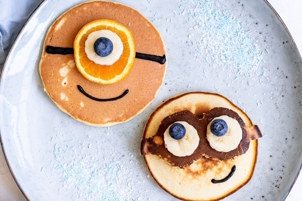 - Za oči Miniončkov uporabimo banano, borovnice in pomarančo, usta pa narišemo z jedilno barvo v tubi.