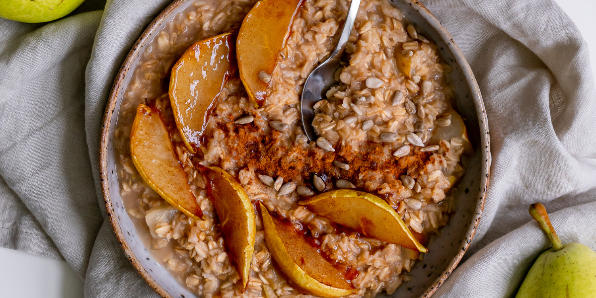 - Ko je kaša pripravljena, jo razdelimo na dva krožnika in na vrh dodamo pražene hruškine rezine s cimetom.
