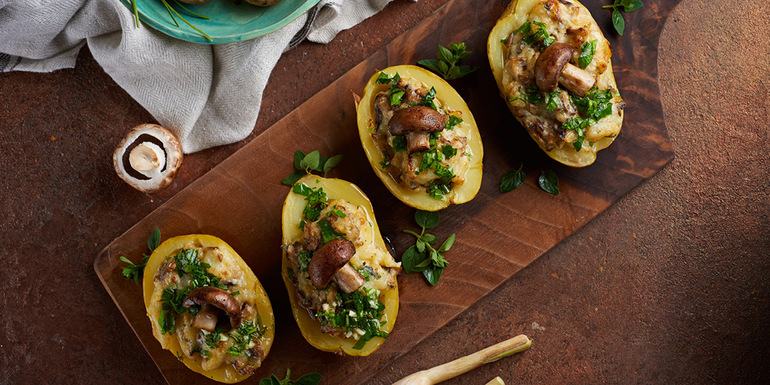 4. Izdolbeno krompirjevo sredico zmečkamo z vilicami in zmešamo s sirom maskarpone, prepraženimi šampinjoni, zelišči, soljo in poprom ter nadevamo nazaj v izdolbene krompirjeve polovice.