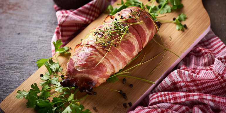 Ribico, ovito s slanino, postavimo v ogreto pečico na 180 stopinj približno za 25–35 minut. Meso mora po peki počivati vsaj 10 minut.