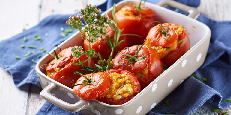 - Kuhan krompir pretlačimo ter dodamo slanino, sir, česen in zelišča. Z maso napolnimo paradižnike.