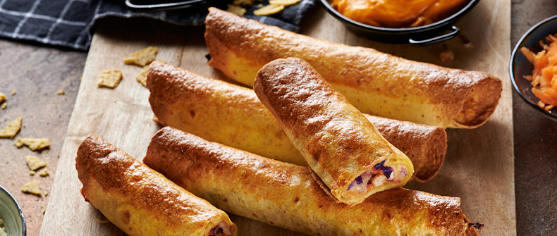 5. Tortilje premažemo z razžvrkljanim jajcem in jih postavimo v pečico za 20 minut. Postrežemo z mehiškimi omakami.
