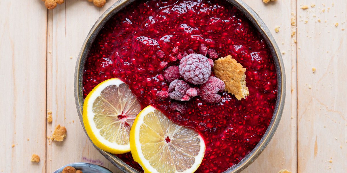 - Malinam dodamo chia semena, sladkor in limonin sok. Vse sestavine z vilivami pretlačimo in dobro premešamo.