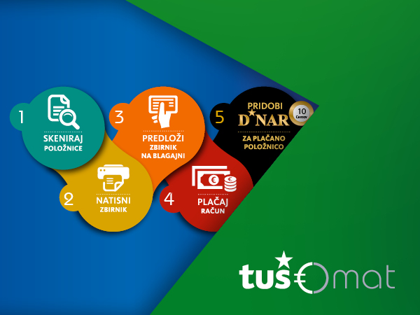 Spoznajte Tušomat, preprosto napravo s pomočjo katere boste hitreje opravili s plačevanjem položnic. Provizija položnice znaša le 0,73 €, poleg tega pa boste za vsako plačano položnico pridobili še 10 centov D*NAR-ja na Tuš klub kartico. Plačevanje položnic na Tušomatu vam torej prinaša D*NAR in prihrani čas.