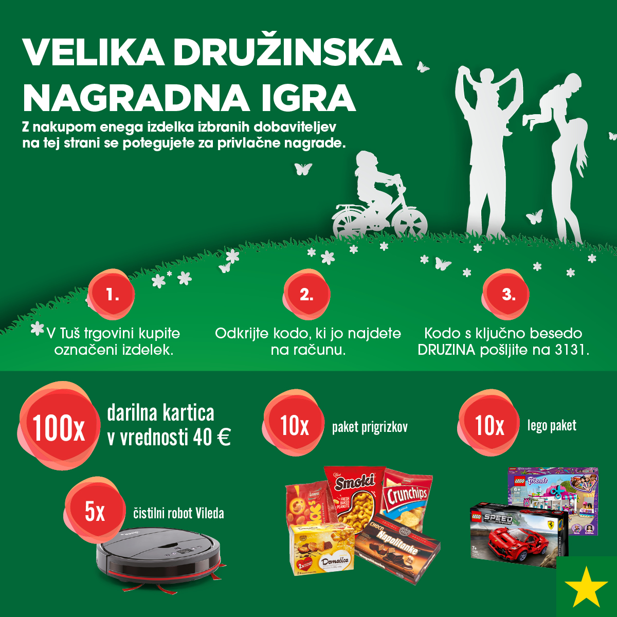 Med pravilnimi odgovori bomo v sklopu vsake od nagradnih objav izžrebali 11 srečnežev, ki bodo prejeli darilno kartico Tuš v vrednosti 100 €. Nagrajenci bodo izžrebani 17. 6., 21. 6. in 26. 6. 2024.
