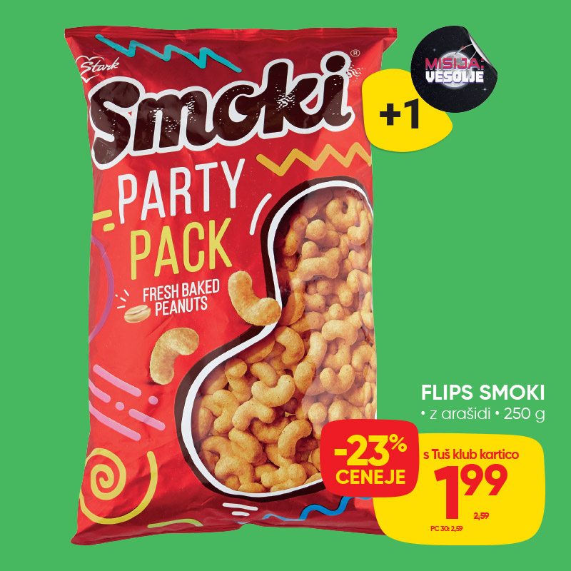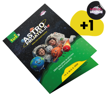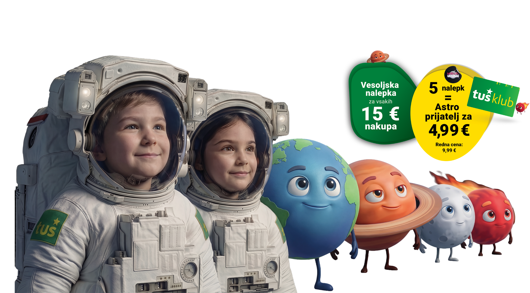 Za vsakih 15 EUR nakupa in ob nakupu izbranih izdelkov člani Tuš kluba prejmete vesoljsko nalepko.* Zberite jih 5 in izberite svojega Astro prijatelja po izjemni ceni 4,99 €.