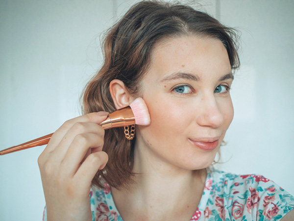 Na obraz nanesemo nekaj barve, sijaja in pomladne svežine. Na lička nanesemo rožnato rdečilo, z brinzerjem rahlo poudarimo predel pod ličnicami in oboje lepo zabrišemo s čopičem, da dosežemo naraven videz. Vse skupaj fiksiramo s fiksirnim pudrom v prahu, ki bo poskrbel za obstojnost in preprečil masten sijaj.