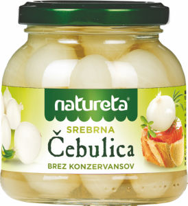 srebrna čebulica, voda, vinski kis, jodirana sol, sladkor, antioksidanti: citronska kislina, askorbinska kislina, ŽVEPLOV DIOKSID