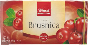 Hibiskus, jabolko, skorja pomaranče, šipek, list zelene mete, list poprove mete, list sladke robide, aroma brusnice 6%, kislina: citronska kislina, brusnica 1%