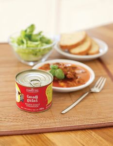 Voda, kuhano goveje meso (30%), goveji loj, paradižnikov koncentrat, PŠENIČNA moka, začimbe in ekstrakti začimb, kuhinjska sol, sladkor, alkoholni kis, ojačevalec okusa (E621). Lahko vsebuje JAJCA, sojo, MLEKO, in ZELENO.