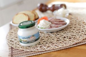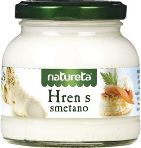 Repično olje, hren 30,5%, SMETANA 22,2%, alkoholni kis, sladkor, voda, gostili: guar gumi, ksantan gumi, jedilna sol, sladka SIROTKA v prahu, posneto MLEKO v prahu, konzervansa: kalijev sorbat, natrijev benzoat, kislina: citronska kislina, MLEČNE BELJAKOVINE, antioksidant: natrijev METABISULFIT. Lahko vsebuje sledove GORČICE.