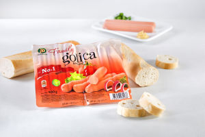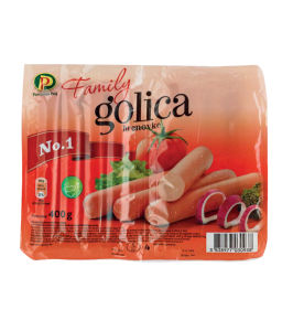 Mehansko izkošeno puranje meso 46%,mehansko izkoščeno piščančje meso 22%, voda, piščančje kožice, sol, grahova vlakna, škrob, stabilizator E450, antioksidanta E300 in E330,česen,ekstrakti začimb, konzervansa E250 in E262