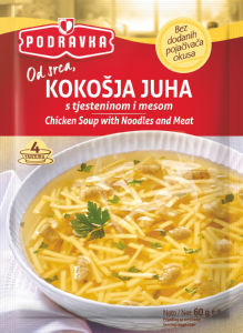 Testenine 63% (durum PŠENIČNI zdrob, JAJCA), jodirana sol (sol, kalijev jodat), sladkor, palmova maščoba, maltodekstrin, izvlečki kvasa, sušeni kokošji izvleček 2,2%, koruzni škrob, sušena zelenjava 1,8% (čebula, ZELENA, korenje), PŠENIČNA moka, sušeno kokošje meso 1,3%, kokošja maščoba, začimbe, naravna aroma, JAJČNI BELJAK v prahu, barvilo (karamel), list peteršilja, antioksidant (izvlečki rožmarina).