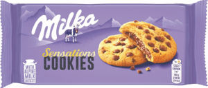 sladkor, PŠENIČNA moka, palmino olje, MLEČNA maščoba, repično olje, kakavova masa, polnomastno MLEKO v prahu, kakavovo maslo, PŠENIČNI škrob, laktoza (iz MLEKA), modificiran škrob, sredstva za vzhajanje (amonijevi karbonati, natrijevi karbonati, difosfati), sirotka v prahu (iz MLEKA), manj masten kakavov prah, emulgator (SOJINI lecitini), sol, arome (vsebujejo MLEKO), posneto MLEKO v prahu, barvilo (karoteni), SOJINE prehranske vlaknine v prahu. Mlečna čokolada vsebuje kakavovi deli najmanj 30%. LAHKO VSEBUJE JAJCA.