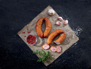 prašičje meso, prašičja slanina, voda, česen, poper, konzervans: natrijev nitrit