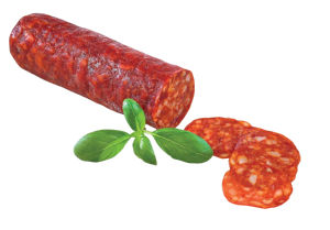 svinjsko meso, slanina, kožna emulzija, nitritna sol, sol, konzervans:natrijev nitrit, naravne začimbe, rastlinske vlaknine, ekstrakti začimb, dekstroza, saharoza, glukozni sirup, regulator kislosti, citronska kislina, ojačevalec okusa (E621), starter kul