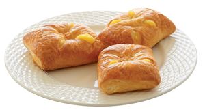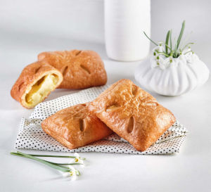 Vaniljev nadev 30 % (voda, pripravek za kremo z okusom vanilje (sladkor, modificiran škrob, sirotka v prahu (vsebuje MLEKO), palmova maščoba, glukozni sirup, kokosova maščoba, sredstvo za zgoščevanje: E 401, MLEČNE beljakovine, sol, stabilizator: E 450, aroma, barvilo: E 160a), rastlinska krema (voda, rastlinske maščobe (olje palmovih koščic, palmovo olje), sladkor, MLEČNE beljakovine, stabilizatorja: E 420ii, E 463, emulgatorja: E 472e, SOJIN lecitin, kislina: kalijev fosfat, arome, barvilo: beta karoten, sol), ekstrakt vanilje), PŠENIČNA bela moka, margarina (rastlinska olja (palma, repica), voda, sol, emulgatorja: sončnični lecitin, E 471, aroma, konzervans: E 202, kislina: citronska kislina, antioksidanta: E 306 in E 304, barvilo: beta karoten, fermentirana PŠENIČNA moka), voda, JAJCA, kvas, sladkor, jodirana sol, sredstvo za izboljšanje zamrznjenih pekovskih izdelkov (PŠENIČNI gluten, emulgator: E 472e, sredstvo za obdelavo moke: askorbinska kislina, procesni encimi), posneto MLEKO v prahu.