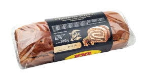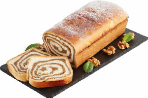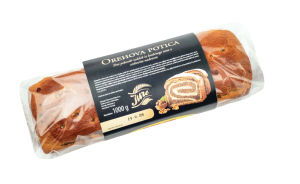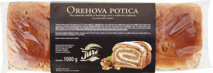 Orehov nadev 50 % (orehova zmes 48 % (sladkor, OREHI 30 %, PŠENIČNI zdrob, instant koruzna moka, sončnično seme, SOJINA moka, MANDLJEVA moka, glukozni sirup, aroma, cimet, antioksidant (askorbinska kislina)), voda, krušne drobtine (PŠENIČNA moka, kvas, jedilna sol)), kvašeno testo 50 % (PŠENIČNA bela moka, voda, sladkor, rastlinska maščoba (palmina), JAJČNI rumenjak, kvas, pripravek iz mlečnih beljakovin (MLČENE beljakovine, rastlinska maščoba (palmina), stabilizator (E 451), antioksidant (E 306)), rum aroma (voda, aromi (rum, vanilin), barvilo (karamel)), jedilna sol, aroma, konzervans (E 282)). Lahko vsebuje sledi drugih oreškov (LEŠNIKI) in SEZAMA. Obstaja možnost prisotnosti luščin.
