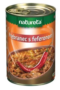 Voda, beli fižol 36%, čebula 7%, sončnično olje, pekoči feferon 3%, mešanica začimb (PŠENIČNA moka, jedilna sol, sušena zelenjava (čebula, korenje, paradižnik, ZELENA, peteršilj), koruzni škrob, sladka paprika, ojačevalci okusa: mononatrijev glutamat, dinatrijev inozinat, sladkor, palmina maščoba, ekstrakt kvasa, sušen česen, začimbe, barvilo: izvleček paprike, pekoča pikantna paprika, aroma), jedilna sol, začimbe, naravna aroma. Lahko vsebuje sledove JAJC in MLEKA.