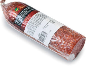 svinjsko meso, slanina, sol, začimbe, arome, dekstroza, svinjski kolagen, maltodekstrin, stabilizator E450, ojačevalec arome E621, starterska kultura, antioksidant E 301, barvilo E120, aroma, konzervans E250.