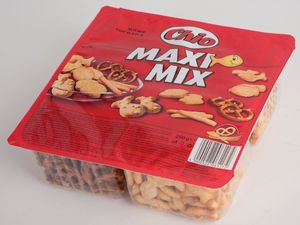 PŠENIČNA moka, rastlinska olje (oljna orgščica in sončnica v spremenljivih deležih), krompirjev škrob, sol, sladkor, sredstva za vzhajanje (amonijevi karbonati, natrijevi karbonati, magnezijevi karbonati), glukozno-fruktozni sirup, krompir v prahu, produkt iz SIROTKE (MLEKO), izvleček JEČMENOVEGA sladu, makova semena, SEZAMOVA semena, SIR v prahu (MLEKO), čebula v prahu, RŽENO kislo testo (voda, RŽENA moka, droži), PINJENEC v prahu, morska sol, naravna aroma, paprika v prahu, sredstvo za uravnavanje kislosti (natrijev hidroksid), izvleček kvasa, MLEČNE beljakovine, maltodekstrin, emulgator (sončnični lecitinI), začimba, kvas v prahu, česen v prahu, barvili (izvleček paprike, kurkumin), kislina (citronska kislina).