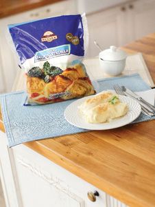 SKUTNI nadev 58 % (SKUTA 70 %, kisla SMETANA, JAJCA, PŠENIČNI zdrob, sončnično olje), PŠENIČNA bela moka, voda, JAJCA, sončnično olje, koruzni škrob, jodirana sol, sredstvo za obdelavo moke: E 920*. n*rastlinskega izvoranLahko vsebuje sojo, oreške in sezam.