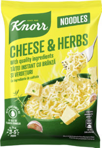 Instantni dehidrirani izdelek. Sestavine: Testenine 85%: PŠENIČNA moka, palmina maščoba, sol, modificirani krompirjev škrob, sladkor, repično olje, izvleček kurkume; Začimbna mešanica 15%: topljeni sir 26% (SIR, sirotka v prahu (MLEKO)), palmina maščoba, sol, ojačevalci arome (natrijev glutamat, dinatrijev-inozinat, dinatrijev gvanilat), sladkor, posušeni glukozni sirup, hidrolizirane rastlinske beljakovine, aroma, krompirjev škrob, nadomestek soli (kalijev klorid), MLEČNE beljakovine, kurkuma, česen v prahu 1,4%, zelišča (drobnjak 0,5%, timijan 0,2%), kislina (citronska kislina), sirotka v prahu (MLEKO). Lahko vsebuje jajca, sojo, zeleno in gorčična semena.