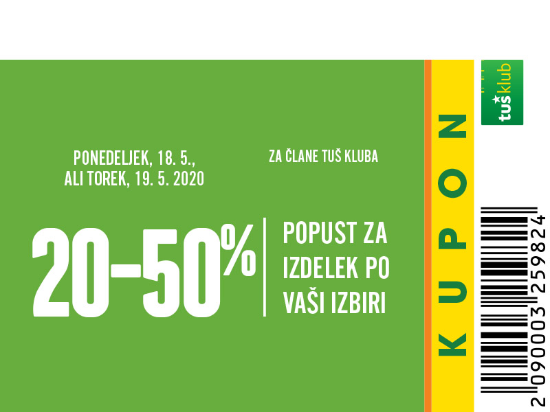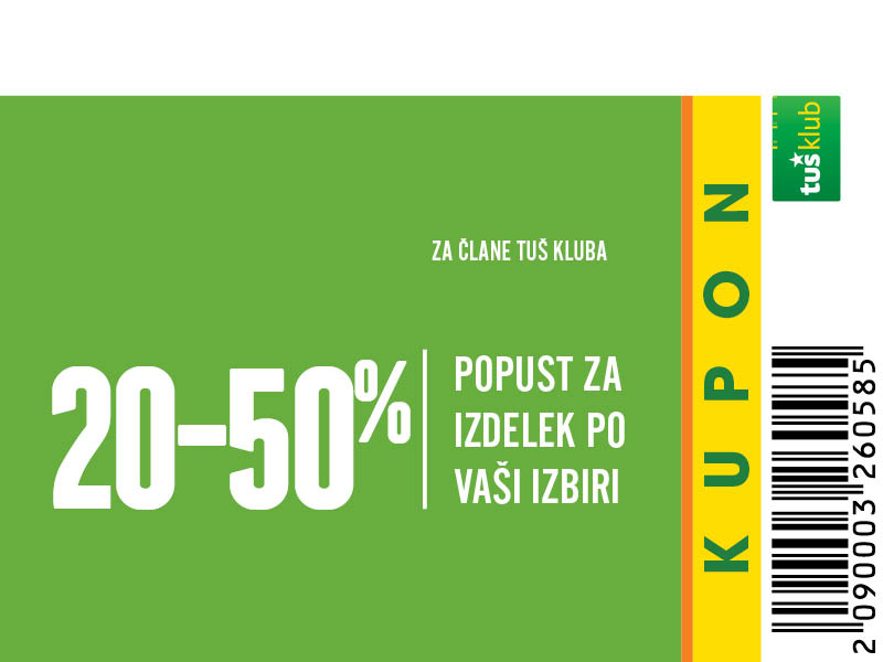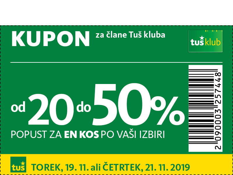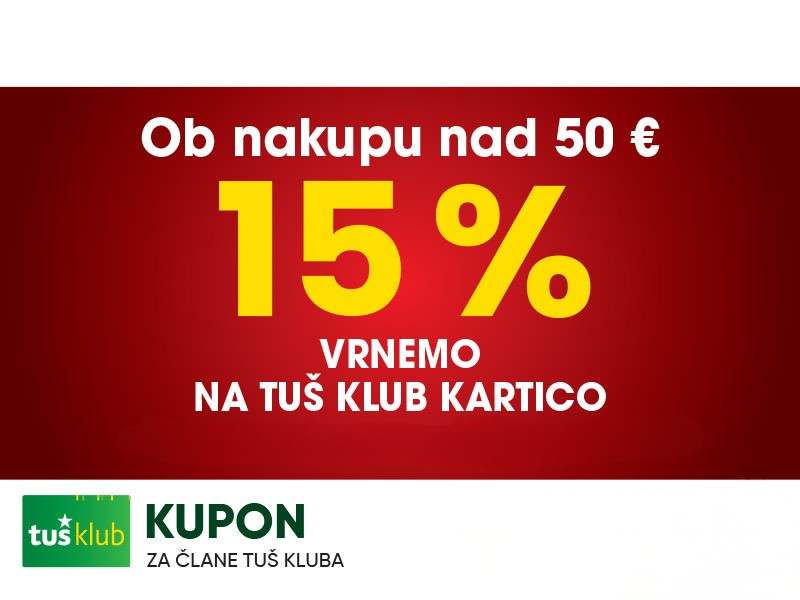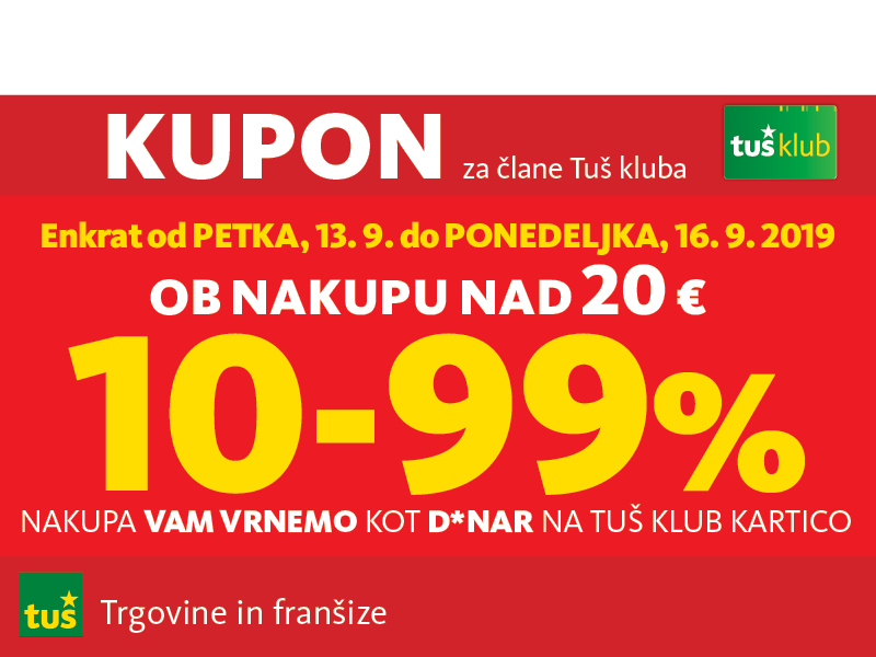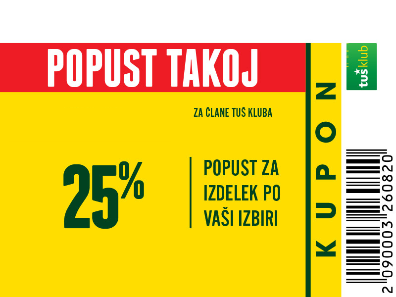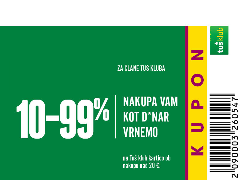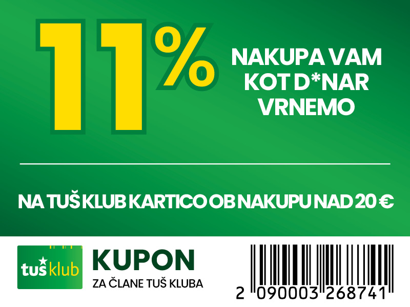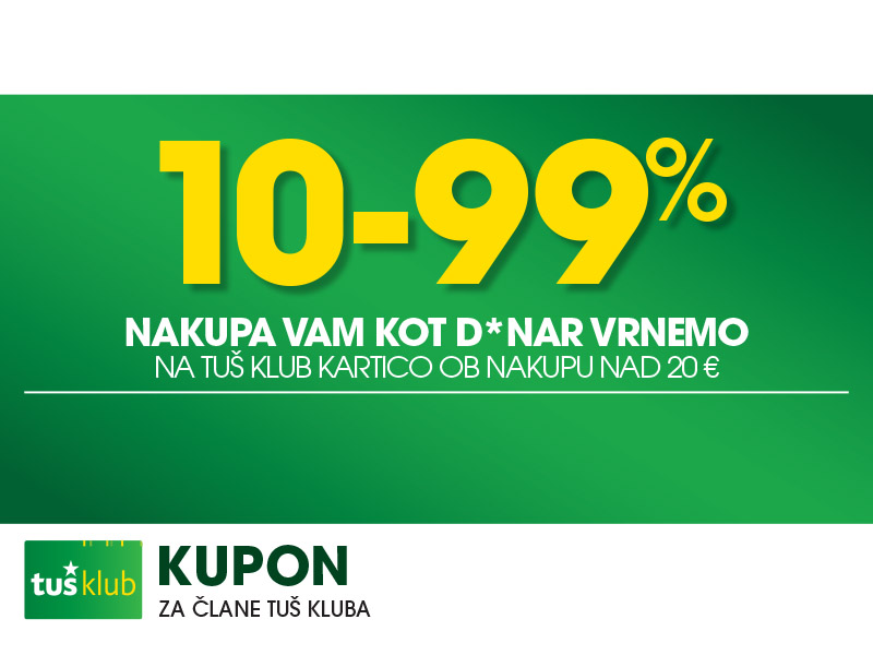 Unovčite lahko 1 kupon za 1 nakup z 1 Tuš klub kartico ali Diners Club Tuš kartico (ali iz letaka ali iz e-obveščanja ali iz mobilne aplikacije). Kupon je unovčljiv ob nakupu nad 50 € v trgovinah in franšizah Tuš. V pogoj 50 € se ne šteje nakup tobačnih izdelkov in pripomočkov, nakup darilnih kartic in plačilo položnic. Popust se naloži kot D*NAR na Tuš klub kartico. Stranka je dolžna pri blagajni opozoriti o uveljavitvi kupona pred zaključkom računa. Kasnejših reklamacij ne upoštevamo. Ista oseba ne more opraviti več zaporednih nakupov z več Tuš klub karticami. D*NAR se obračuna samo na izdelke z redno ceno. Ne velja na izdelke z akcijsko ceno, na izdelke iz ponudbe za KRATEK ČAS in SUPER CENA, iz odprodaje, znižane pred iztekom roka uporabe, izdelke, pri katerih je v promocijskih materialih pripisano, da se nanje ne obračunajo dodatne ugodnosti in izdelek, za katerega se uveljavlja kupon za izdelek po izbiri (kupon 25 % za izbrani izdelek). D*NAR se prav tako ne obračuna za časopise in revije, knjige, cigarete, tobačne izdelke in pripomočke, kartice in predplačniške pakete mobilnih operaterjev, vrednostnice za mobilne telefone, za začetne formule, povratno embalažo, plačilo položnic, nakup darilnih bonov ali vrednostnih kartic, za darilne pakete Zvezdar in Select Box, za pelete, plin v plinskih jeklenkah in za plinske jeklenke. V primeru obročnega odplačevanja kupona ni mogoče uveljavljati. Kupon ne velja za pravne osebe in samostojne podjetnike posameznike. Pri nakupu se lahko izkoristi samo ena ugodnost za nakup (popust ne velja na druge popuste za nakup oz. se z njimi izključuje). D*NAR se ne obračuna pri nakupu izdelkov v franšiznih mesnicah, ki jih le-te dajejo v najem. Kupon ni unovčljiv v spletnem supermarketu hitrinakup.com.