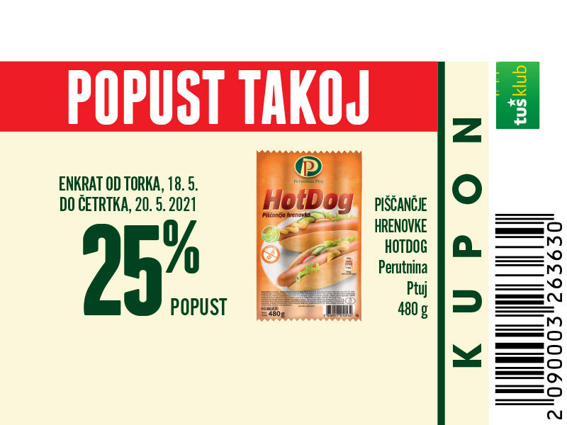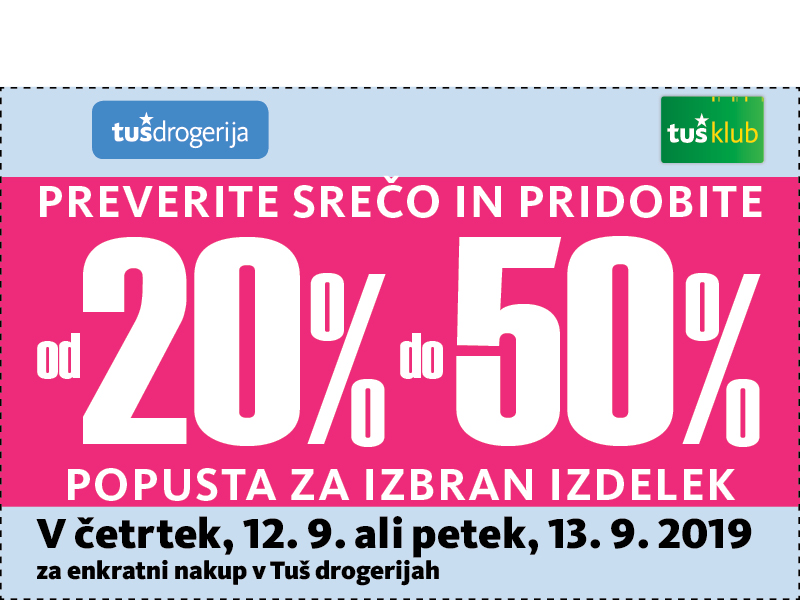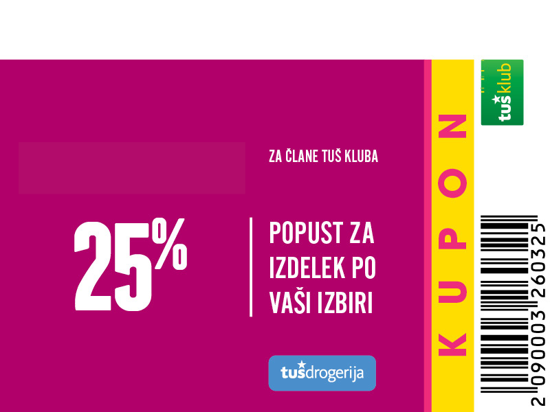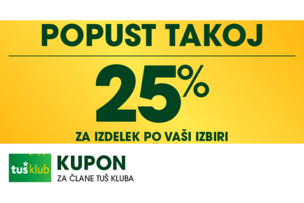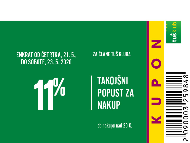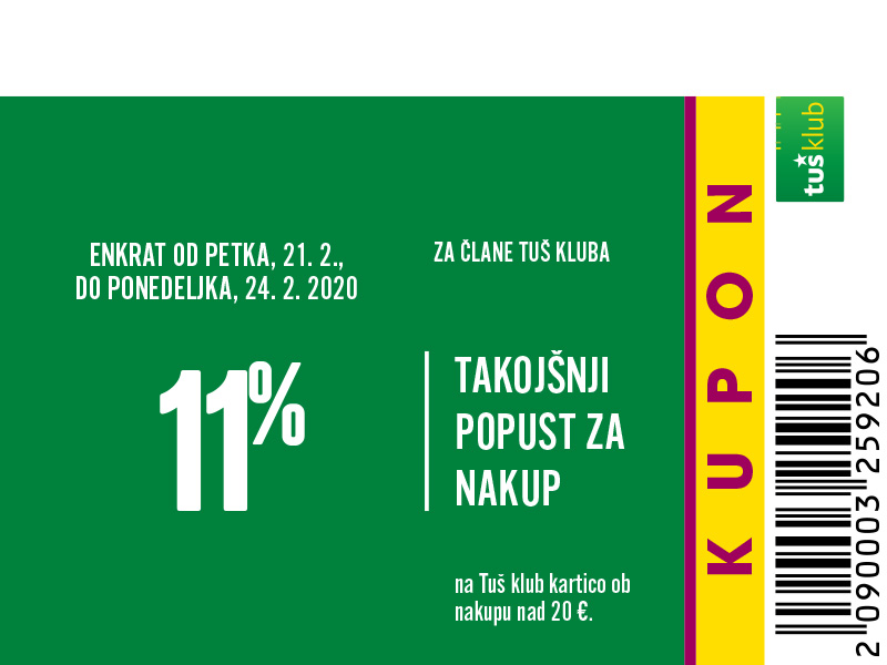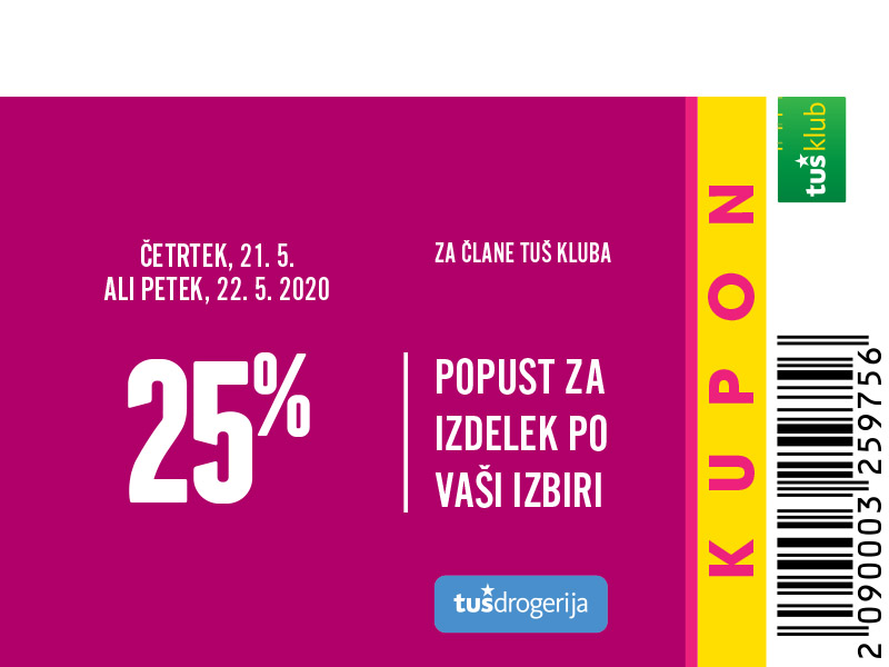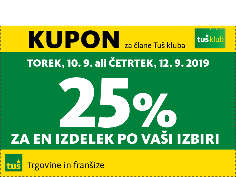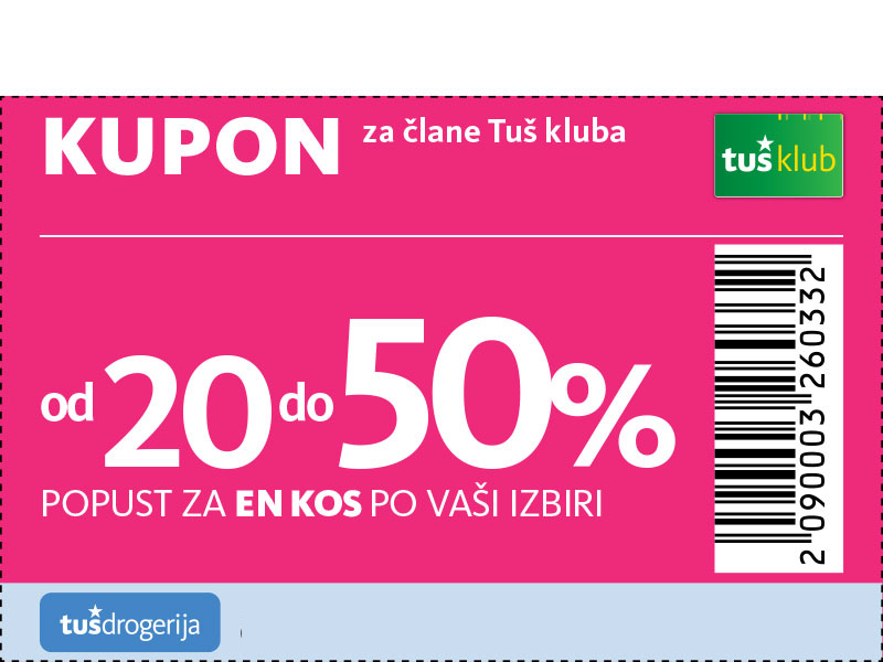 Unovčite lahko 1 kupon za 1 nakup z 1 Tuš klub kartico ali Diners Club Tuš kartico (ali iz letaka ali iz e-obveščanja ali iz mobilne aplikacije). Kupon je unovčljiv ob nakupu nad 50 € v trgovinah in franšizah Tuš. V pogoj 50 € se ne šteje nakup tobačnih izdelkov in pripomočkov, nakup darilnih kartic in plačilo položnic. Popust se naloži kot D*NAR na Tuš klub kartico. Stranka je dolžna pri blagajni opozoriti o uveljavitvi kupona pred zaključkom računa. Kasnejših reklamacij ne upoštevamo. Ista oseba ne more opraviti več zaporednih nakupov z več Tuš klub karticami. D*NAR se obračuna samo na izdelke z redno ceno. Ne velja na izdelke z akcijsko ceno, na izdelke iz ponudbe za KRATEK ČAS in SUPER CENA, iz odprodaje, znižane pred iztekom roka uporabe, izdelke, pri katerih je v promocijskih materialih pripisano, da se nanje ne obračunajo dodatne ugodnosti in izdelek, za katerega se uveljavlja kupon za izdelek po izbiri (kupon 25 % za izbrani izdelek). D*NAR se prav tako ne obračuna za časopise in revije, knjige, cigarete, tobačne izdelke in pripomočke, kartice in predplačniške pakete mobilnih operaterjev, vrednostnice za mobilne telefone, za začetne formule, povratno embalažo, plačilo položnic, nakup darilnih bonov ali vrednostnih kartic, za darilne pakete Zvezdar in Select Box, za pelete, plin v plinskih jeklenkah in za plinske jeklenke. V primeru obročnega odplačevanja kupona ni mogoče uveljavljati. Kupon ne velja za pravne osebe in samostojne podjetnike posameznike. Pri nakupu se lahko izkoristi samo ena ugodnost za nakup (popust ne velja na druge popuste za nakup oz. se z njimi izključuje). D*NAR se ne obračuna pri nakupu izdelkov v franšiznih mesnicah, ki jih le-te dajejo v najem. Kupon ni unovčljiv v spletnem supermarketu hitrinakup.com.