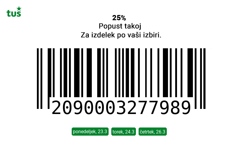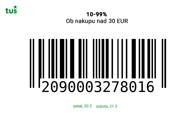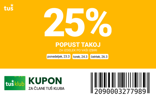 Unovčite lahko 1 kupon za 1 nakup z 1 Tuš klub kartico (ali iz letaka ali iz e-obveščanja ali iz mobilne aplikacije). Kupon je unovčljiv ob nakupu nad 30 € v trgovinah in franšizah Tuš. V pogoj 30 € se ne šteje nakup tobačnih izdelkov in pripomočkov, nakup darilnih kartic in plačilo položnic. Popust se naloži kot D*NAR na Tuš klub kartico. Stranka je dolžna pri blagajni opozoriti o uveljavitvi kupona pred zaključkom računa. Kasnejših reklamacij ne upoštevamo. Ista oseba ne more opraviti več zaporednih nakupov z več Tuš klub karticami. D*NAR se obračuna samo na izdelke z redno ceno. Ne velja na izdelke z akcijsko ceno, na izdelke iz ponudbe za KRATEK ČAS in SUPER CENA, iz odprodaje, znižane pred iztekom roka uporabe, izdelke, pri katerih je v promocijskih materialih pripisano, da se nanje ne obračunajo dodatne ugodnosti in izdelek, za katerega se uveljavlja kupon za izdelek po izbiri (kupon 25 % za izbrani izdelek). D*NAR se prav tako ne obračuna za časopise in revije, knjige, cigarete, tobačne izdelke in pripomočke, kartice in predplačniške pakete mobilnih operaterjev, vrednostnice za mobilne telefone, za začetne formule, povratno embalažo, plačilo položnic, nakup darilnih bonov ali vrednostnih kartic, za darilne pakete Zvezdar in Select Box, za pelete, plin v plinskih jeklenkah in za plinske jeklenke. V primeru obročnega odplačevanja kupona ni mogoče uveljavljati. Kupon ne velja za pravne osebe in samostojne podjetnike posameznike. Pri nakupu se lahko izkoristi samo ena ugodnost za nakup (popust ne velja na druge popuste za nakup oz. se z njimi izključuje). D*NAR se ne obračuna pri nakupu izdelkov v franšiznih mesnicah, ki jih le-te dajejo v najem. Kupon ni unovčljiv v spletnem supermarketu hitrinakup.com.