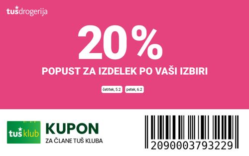 Unovčite lahko 1 kupon (ali iz letaka ali iz e-obveščanja ali iz mobilne aplikacije) za 1 nakup na 1 Tuš klub kartico za 1 izdelek. Kupon je unovčljiv v Tuš drogerijah in ne velja za spletno Tuš drogerijo. Stranka je dolžna na blagajni opozoriti o uveljavitvi kupona pred zaključkom računa. Kasnejših reklamacij ne upoštevamo. Ista oseba ne more opraviti več zaporednih nakupov z večimi Tuš klub karticami. Kupon ne velja na akcijsko ceno, izdelke iz akcije Tuš klub najmanj - 50 %, izdelke iz lojalnostnih programov, izdelke iz akcije Mojih 10 najljubših, izdelke iz odprodaje, znižane pred iztekom roka uporabe, na gratis izdelke in gratis pakiranja iz povezanih nakupov, na akcijo Kupi več plačaj manj, na izdelke, pri katerih je v promocijskih materialih pripisano, da se nanje ne obračunajo dodatne ugodnosti, na nastavke za električne zobne ščetke Philips Sonicare, na izdelka z EAN 770201841184 Gillette Mach 3 16/1 in EAN 770201847088 Gillette Fusion 16/1, peneča vina, žgane pijače (tudi z manj kot 15 vol.% alk.) ter na knjige, darilne in vrednostne kartice. Kupon prav tako ne velja za kartice in predplačniške pakete mobilnih operaterjev. Kupon se ne sešteva z drugimi popusti. Na izdelek, za katerega se uveljavlja ta kupon za izbrani izdelek, se ne obračunajo druge ugodnosti na nakup. V primeru obročnega odplačevanja kupona ni mogoče uveljavljati. Kupon ne velja za pravne osebe in samostojne podjetnike posameznike.