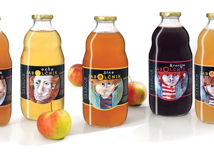 Družina Jabolčnik prodaja šest jabolčnih sokov: mamo, očeta, sina in jabolčna