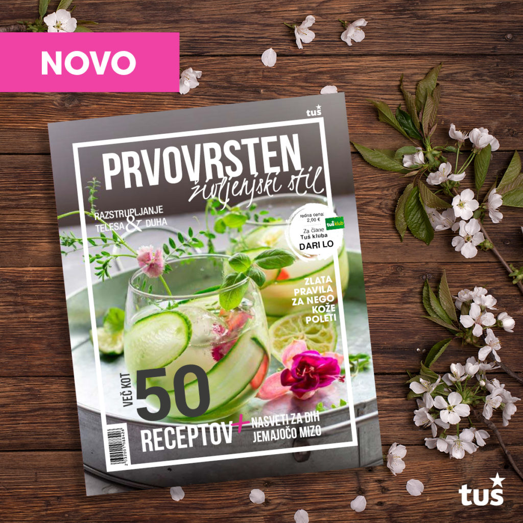 V njej smo zbrali zanimive pomladno-poletne vsebine, ki vas bodo popeljale za dih jemajočo mizo, svetujemo vam, kako izbrati rastline za balkon ali teraso, čakajo vas zlata pravila za poletno nego kože, nasveti za razstrupljanje telesa in duha, v vaši kuhinji pa bo pestro zaradi več kot 50 navdušujočih receptov. Pripravili smo tudi velik horoskop, več strani pobarvanke za odrasle in nagradno križanko. Uživajte v Prvovrstnem življenjskem stilu! Še to, revija je za člane Tuš kluba brezplačna.
