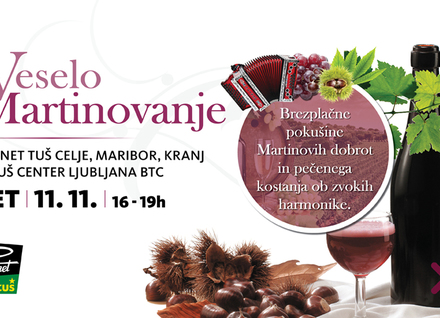 V petek, 11. novembra v Planetih Tuš Celje, Maribor in Kranj ter Tuš centru Ljubljana BTC pripravljamo vesela martinovanja. Za naše kupce bodo ob zvokih harmonike na voljo brezplačne pokušine martinovih dobrot in pečenega kostanja. V Kranju in Ljubljani nas bo celo obiskala igralka Usodnega vina Ana Ruter.