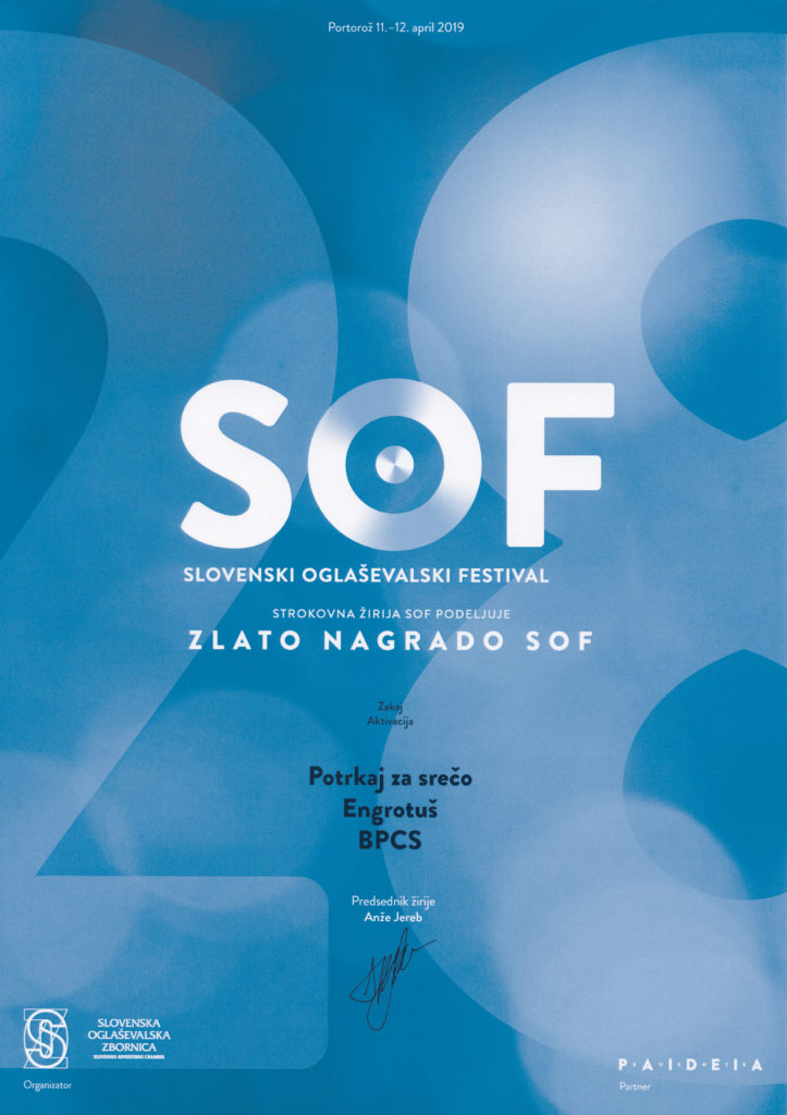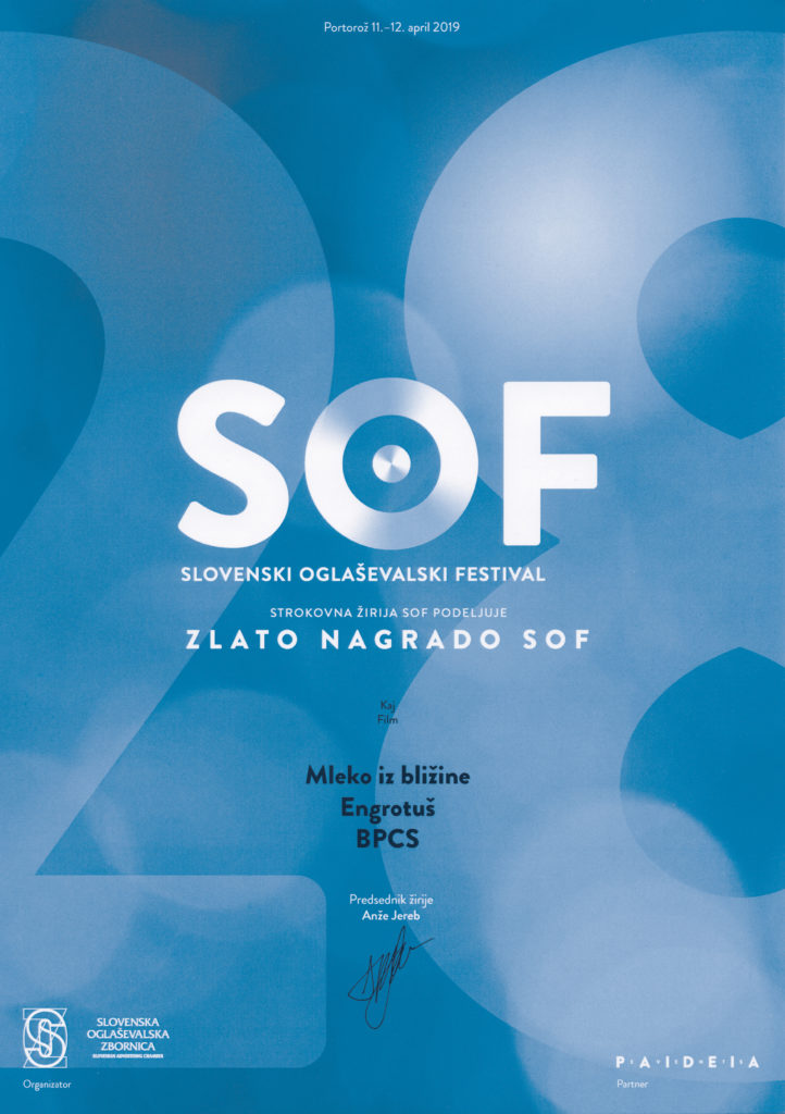 - Leta 2019 smo na Slovenskem oglaševalskem festivalu prejeli tri prestižne nagrade za naše marketinške kampanje: zlato nagrado SOF za kampanji Mleko iz bližine in Potrkaj za srečo ter srebrno nagrado SOF za oglas Naravno drugačni.