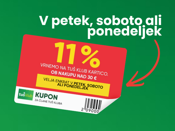 V petek, 6. 2., soboto, 7. 2., ali ponedeljek, 9. 2. 2026, vam ob nakupu nad 30 € vrnemo 11 % na Tuš Klub kartico.