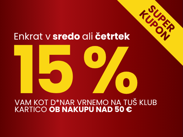 Ta konec tedna vas v Tušu čaka kupon, s katerim vam ob nakupu nad 50 € vrnemo kar 15 % vrednosti nakupa kot D*NAR na vašo Tuš klub kartico. Unovčite ga v sredo ali četrtek, 29. ali 30. 4. 2026. Ne zamudite priložnosti.