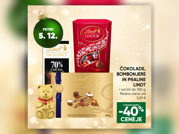 Samo v petek, 5. 12. 2025, čokolade, bombonjere in praline Lindt (več vrst) kar 40 % CENEJE.