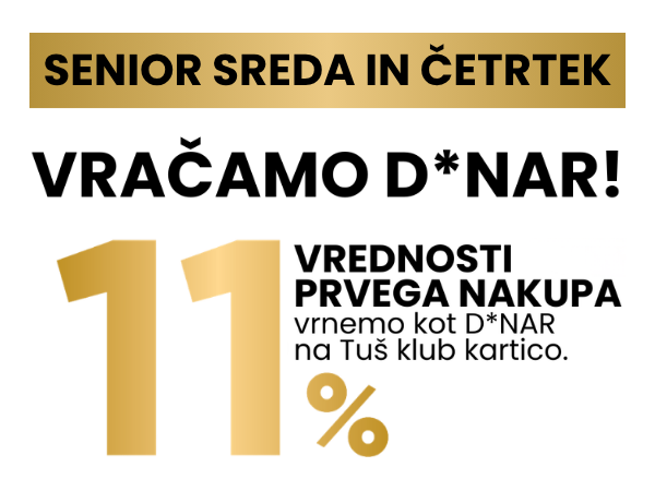 Dragi člani Tuš Senior kluba, v sredo, 29. 4., in četrtek, 30. 4. 2026, vam vrnemo 11 % vrednosti prvega nakupa kot D*NAR na vašo Tuš klub kartico.*