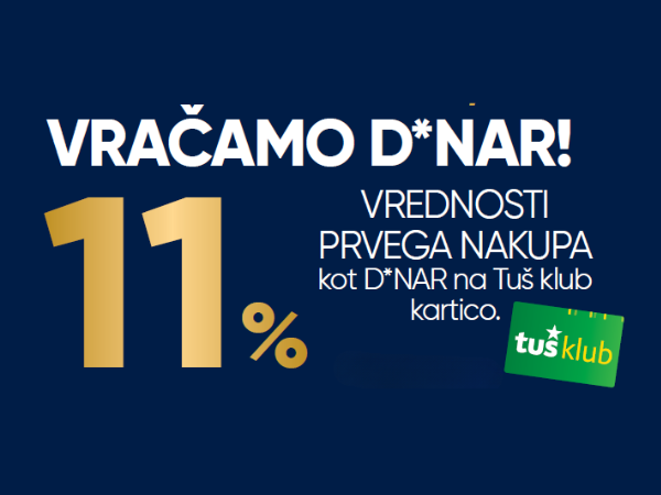 Dragi člani Tuš Senior kluba, v sredo, 4. 2. 2026, vam vrnemo 11 % vrednosti prvega nakupa kot D*NAR na vašo Tuš klub kartico.