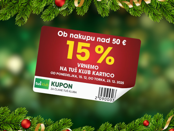 Med 15. in 23. 12. 2025 vam ob nakupu nad 50 € vam 15 % vrnemo na Tuš Klub kartico.