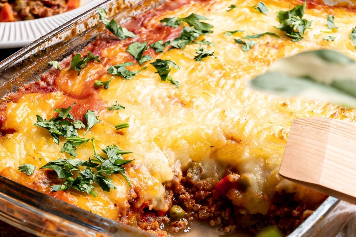 - Ko je mesna mešanica pripravljena, jo enakomerno porazdelimo po dnu globokega pekača. Po vrhu enakomerno porazdelimo pretlačen krompir.