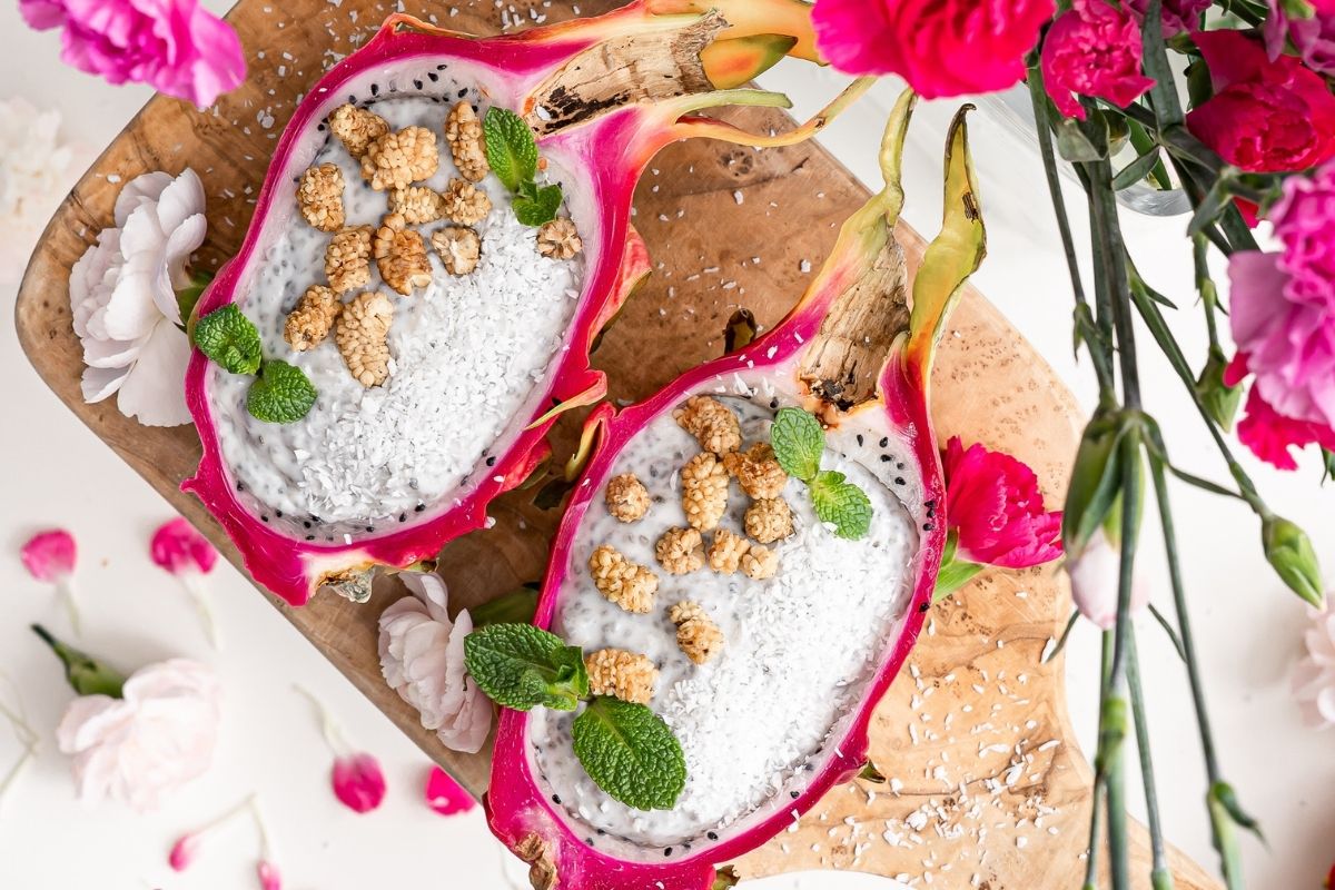 - V večji posodi zmešamo pitajo, chia semena, kokosovo kremo (uporabimo samo gosti del), kokosovo mleko, med in kokos.