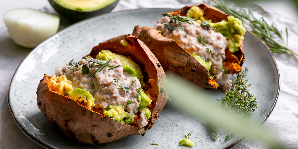 - Ko je krompir pečen, ga vzamemo iz pečice, po dolžini prerežemo ter napolnimo z zmečkanim avokadom in tuninim nadevom.