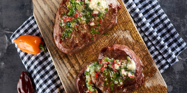 Maslu, ogretem na sobno temperaturo, dodamo česen, peteršilj, čili in nastrgano limonino lupino. Premešamo, zavijemo v folijo in postavimo v hladilnik, da se malo strdi. Posoljene fileje postavimo na direkten ogenj pri 220 stopinjah Celzija in pečemo približno 3 minute na stran oz. do središčne temperature 52 stopinj Celzija. Po peki naj fileji počivajo na deski približno 5 minut, medtem pa jim dodamo košček zeliščnega masla, da se meso lepo začini.