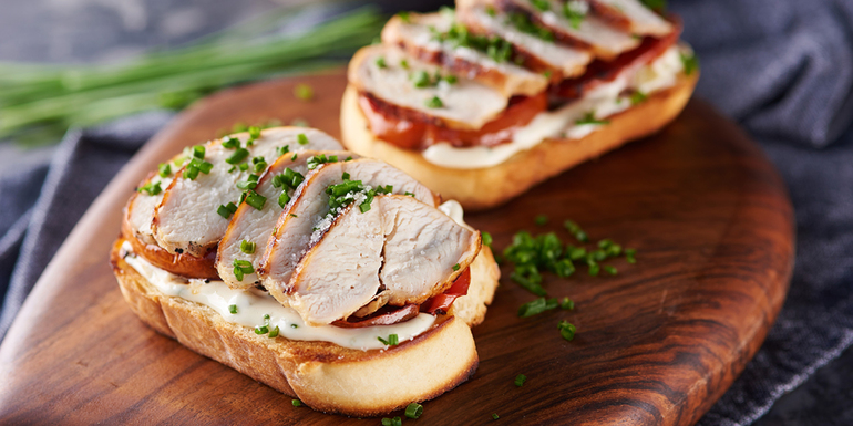 Na že ogret žar na direkten ogenj postavimo piščančje prsi v kosu. Ko je meso zapečeno, ga prestavimo na indirekten ogenj, kjer ga pečemo do središčne temperature 75 stopinj Celzija. Medtem na ponvi popečemo debele rezine paradižnika in pripravimo omako. V majonezo dodamo na drobno narezane kumarice in drobnjak. Ko prsa dosežejo želeno središčno temperaturo, jih postavimo na desko in pustimo počivati pet minut. Medtem popečemo rezine kruha in začnemo s sestavljanjem. Na popečen kruh položimo pečene rezine paradižnika, nato dodamo rezine piščančjih prs in dodamo omako.