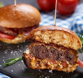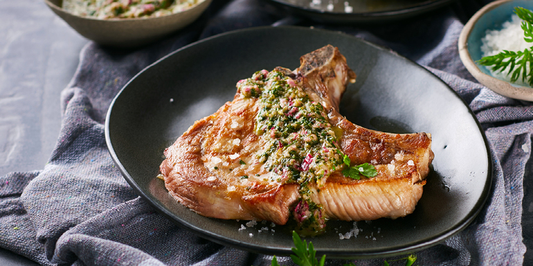 Kotlete popečemo na obeh straneh, približno tri minute na stran, nato pa s termometrom preverimo središčno temperaturo mesa. Če še nismo dosegli središčne temperature 60 stopinj, kotlete prestavimo na indirektno peko in tam dokončamo do središčne temperature 60 stopinj. Medtem pa lahko pripravimo chimichurri omako. V sekljalnik damo peteršilj, čebulo, česen, sladkor, kis, limonin sok in olivo olje ter zmešamo. Na pečene kotlete dodamo malo chimichurri omake in postrežemo.