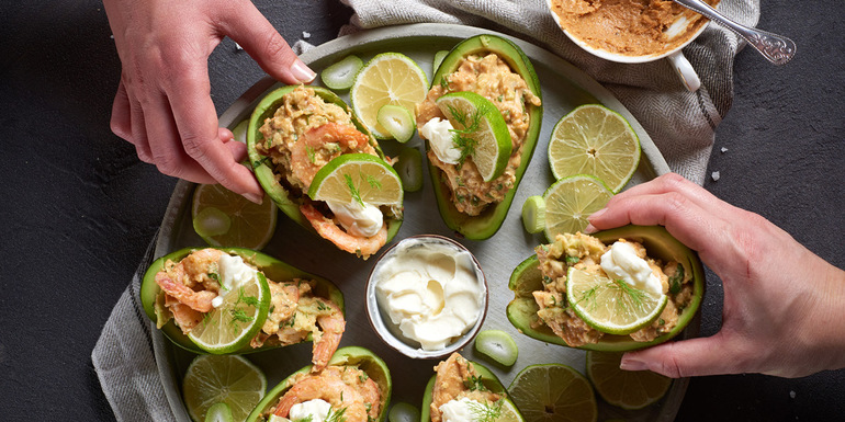5. Oba nadeva razporedimo v izdolbene avokadove lupine.