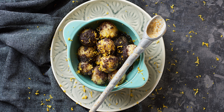 2. Krompir pretlačimo, dodamo moko, limonovo lupinico in zamesimo v testo.