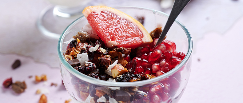 - suho jagodičevje, čokolada, grobi kokosovi kosmiči